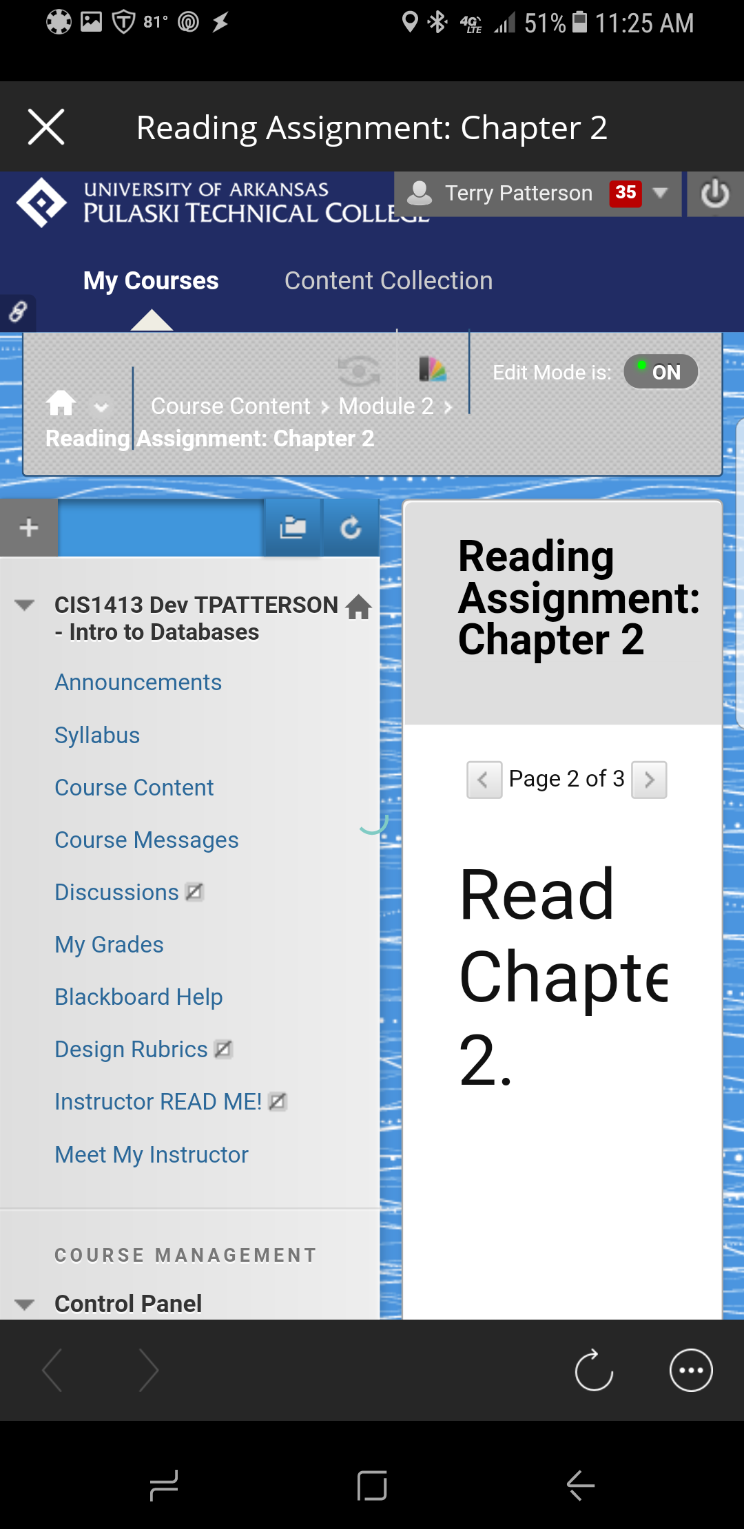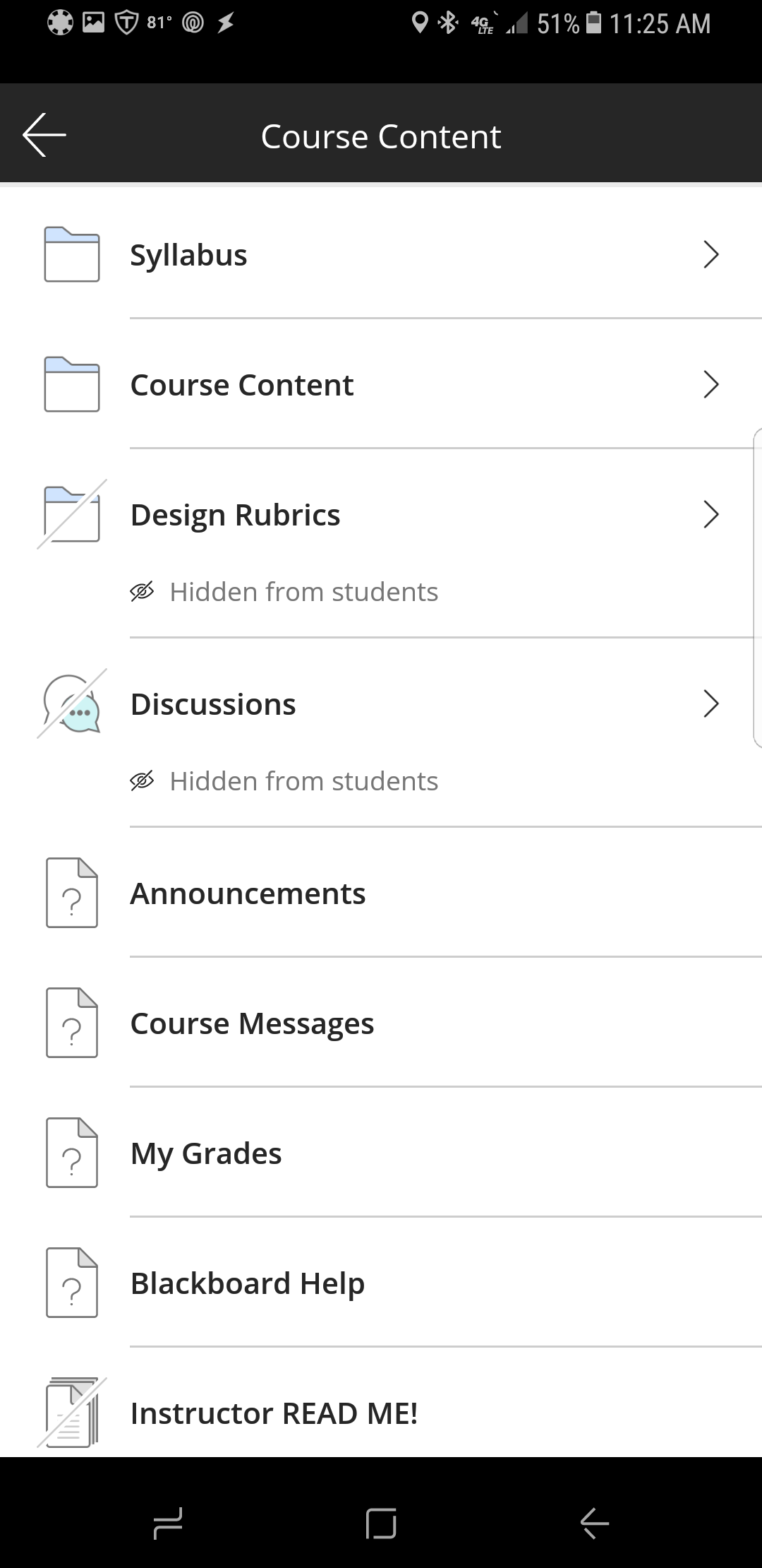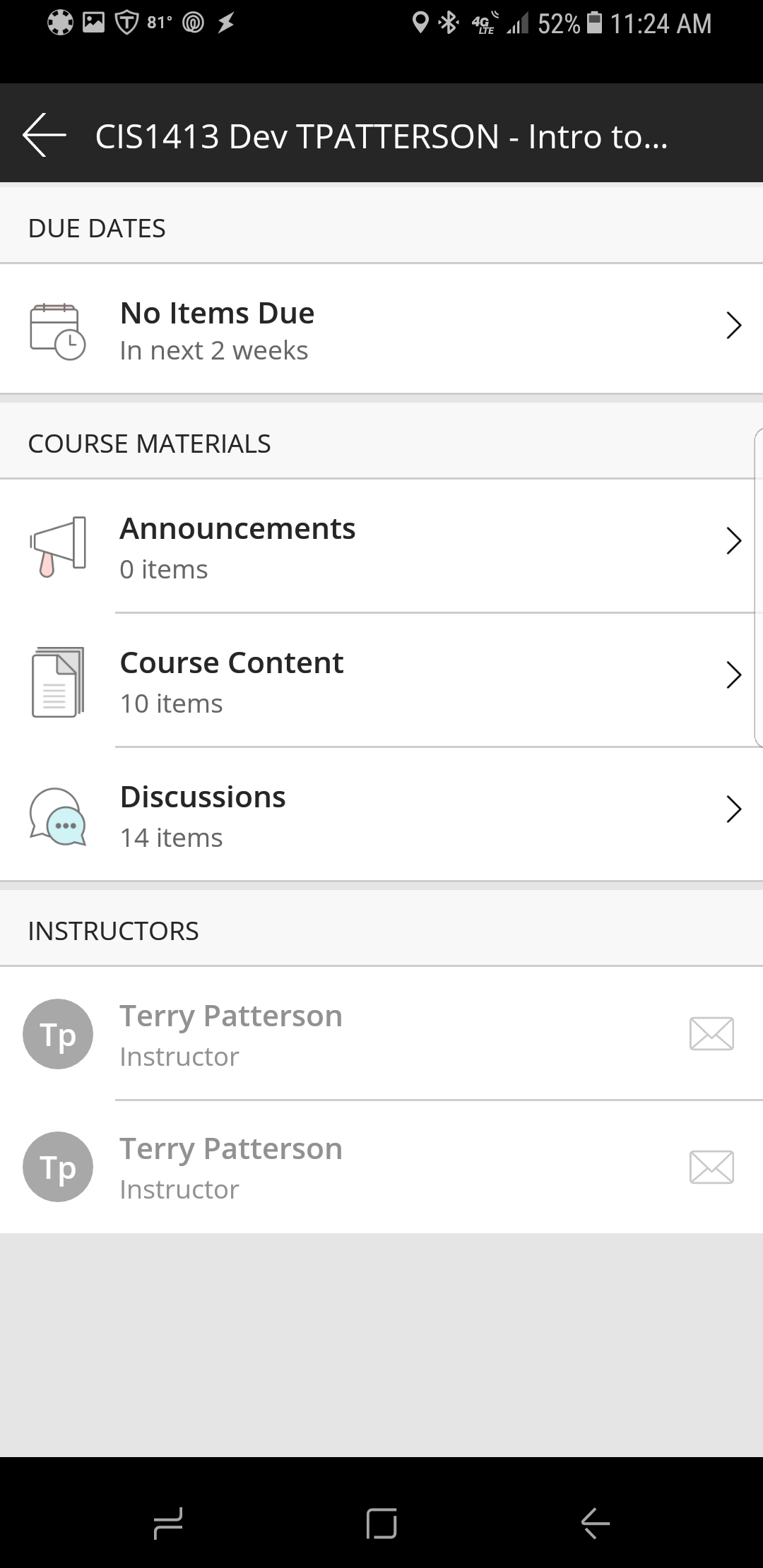 When in a course, you see a simple set of information. Currently the course only lists Due Dates, Course Materials which includes Announcements Course Contents, and Discussions. According to Blackboard Instructor’s product manager, Dan Loury, they plan to rollout the grading feature in the 2nd half of 2017. When you tap on the Course Contents option in the menu, you will see any items or subfolders within that content area. This move continues to show the user interface the user expects. However in the image below, you can see that clicking (or tapping) on a link or item sends the user to the Blackboard web application and doesn’t display the content within the app. This quickly takes the user out of the “magic” of the app, and lifts the curtain for us to see a possible rough classic interface our college uses.